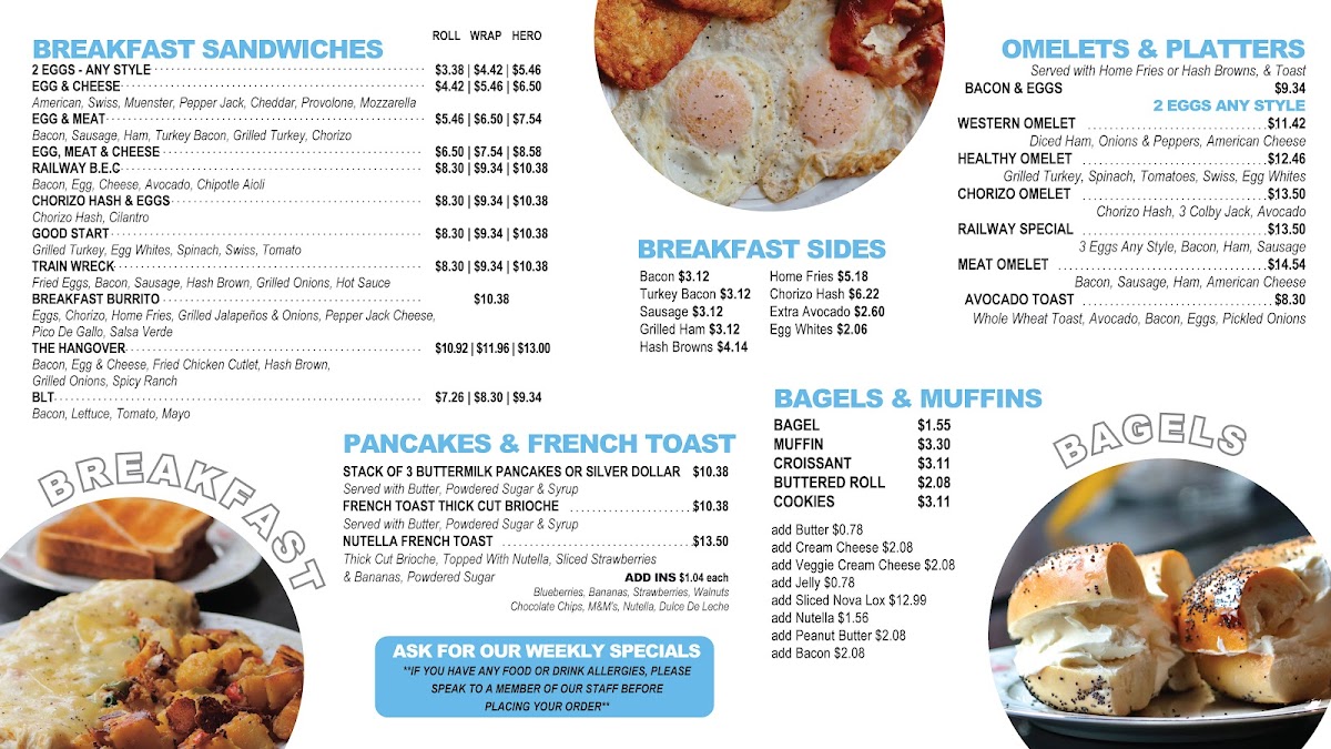 Welcome to Railway Cafe&Grill, a delightful spot located at 389 Elwood Ave, Hawthorne, NY. Renowned for its vibrant atmosphere and inviting staff, this cafe specializes in a diverse breakfast menu that caters to every palate. Indulge in their mouthwatering breakfast sandwiches, from the classic Egg Sandwich starting at just $3.38 to the luxurious Railways Bec Sandwich at $8.30, layers of bacon, egg, cheese, and avocado drizzled with chipotle aioli.